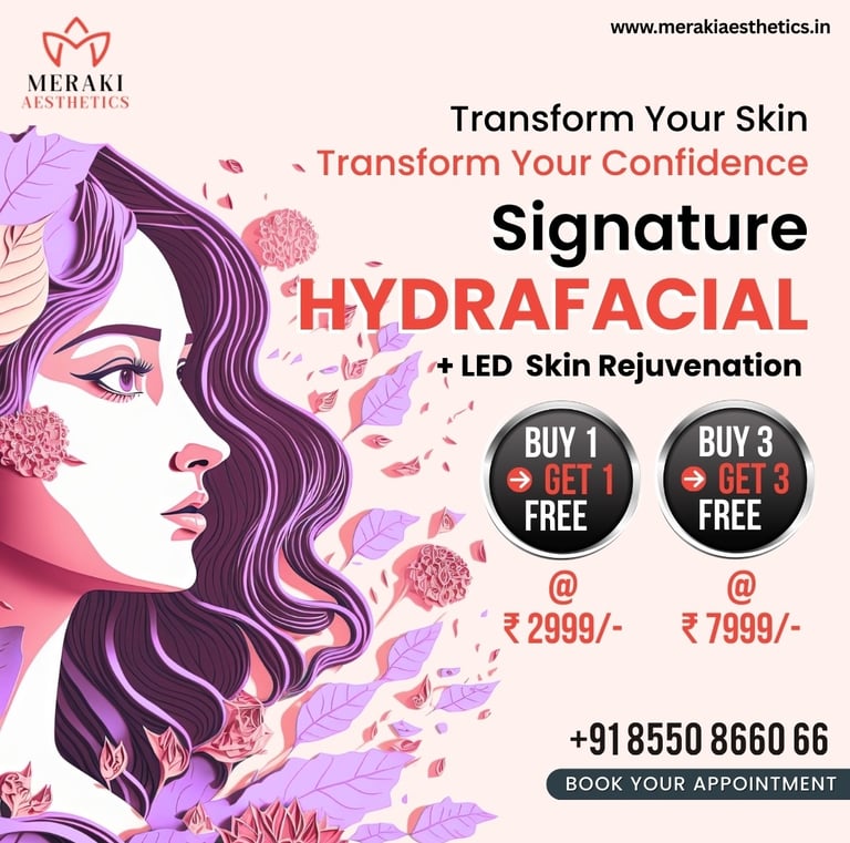 Our Signature Hydra Medifacial is a premium, dermatologist-designed treatment that delivers deep cleansing, intense hydration, and a radiant glow in just one session. At Meraki Aesthetics, we combine advanced hydradermabrasion technology with targeted serums to gently exfoliate, extract impurities, and infuse the skin with essential nutrients.